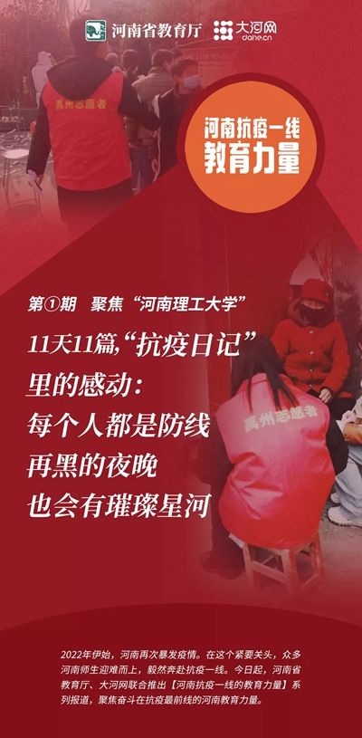 2022年伊始,河南再次暴发疫情。在这个紧要关头,众多河南师生不惧风险,不怕困难,迎难而上,毅然奔赴抗疫一线,为守护万千家庭贡献出自己的力量。今日起,河南省教育厅、大河网联合推出【河南抗疫一线的教育力量】系列报道,聚焦奋斗在抗疫最前线的河南教育力量。