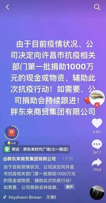 近期,很多浏览短视频应用的许昌人都刷到过这样一条视频,胖东来商贸集团公司决定向许昌市抗疫相关部门第一次捐助1000万元的现金或物资,辅助此次抗疫行动。看到这条视频,河南大学2018级学生段懿航有些激动地说:“真的,你永远可以相信‘胖东来’!去年武汉疫情爆发,胖东来就捐助了5000万。如此大的格局,为‘胖东来’点赞!”