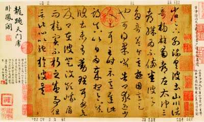 传唐代摹本王羲之书《游目帖》(又名《蜀都帖》《山川诸奇帖》),清乾隆年间为乾隆皇帝所藏,并镌刻于《三希堂法帖》内。据说,这件作品后赐予恭亲王,义和团事件时从该王府流出,辛亥革命后传入日本。该作品后由日本广岛的安达万藏收藏,1945年毁于广岛原子弹爆炸。历经千年的时光流转,终化为尘埃。图片选自《近代国宝海外流失录》