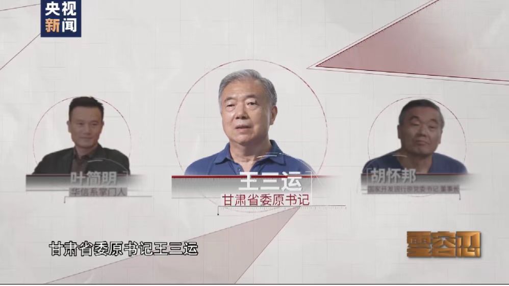 记者注意到,在介绍胡怀邦案时,已落马的甘肃省委原书记王三运亮相专题片,透露了自己与胡怀邦、“华信系”掌门人叶简明之间的权钱交易。
