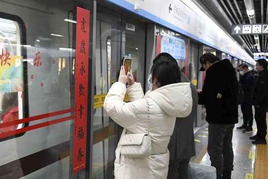 2022年1月15日,长沙,乘客在地铁站点拍摄春联。当日,湖南长沙地铁部分站点的站台屏蔽门贴上红火的春联,年味十足。 中新社记者 杨华峰 摄
