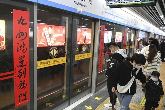 2022年1月15日,长沙地铁部分站点的站台屏蔽门贴上红火的春联,年味十足。 中新社记者 杨华峰 摄