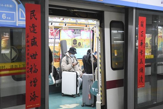 2022年1月15日,长沙,乘客等待地铁列车。当日,湖南长沙地铁部分站点的站台屏蔽门贴上红火的春联,年味十足。 中新社记者 杨华峰 摄