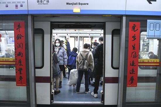 2022年1月15日,长沙,乘客走进地铁列车。当日,湖南长沙地铁部分站点的站台屏蔽门贴上红火的春联,年味十足。 中新社记者 杨华峰 摄