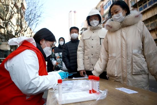 2022年1月15日,天津进行第三次全员核酸检测,大批志愿者在一线执行筛查服务工作服务。志愿者挨家挨户敲门提醒居民验核酸。