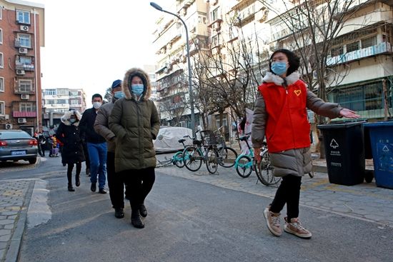 2022年1月15日,天津进行第三次全员核酸检测,大批志愿者在一线执行筛查服务工作服务。志愿者引导居民到指定地点验核酸。