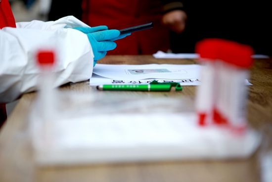 2022年1月15日,天津进行第三次全员核酸检测,大批志愿者在一线执行筛查服务工作服务。志愿者为验核酸居民录入信息。