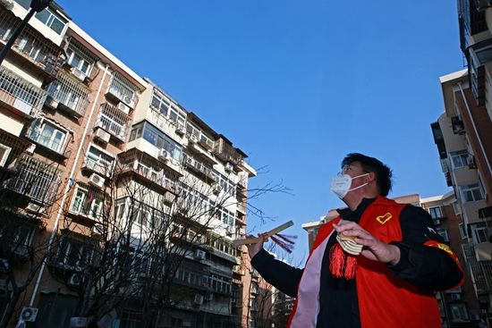 2022年1月15日,天津进行第三次全员核酸检测,大批志愿者在一线执行筛查服务工作服务。图为志愿者用快板呼喊验核酸居民。