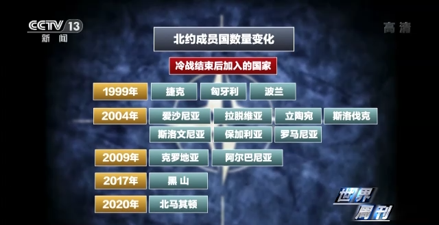1999年,北约接纳匈牙利、波兰和捷克成为北约成员国;2004年又吸收保加利亚、拉脱维亚、立陶宛、罗马尼亚、斯洛伐克、斯洛文尼亚和爱沙尼亚等7国为其正式成员;2009年同意阿尔巴尼亚和克罗地亚加入北约;2017年批准黑山加入北约;2020年,又吸纳了北马其顿。