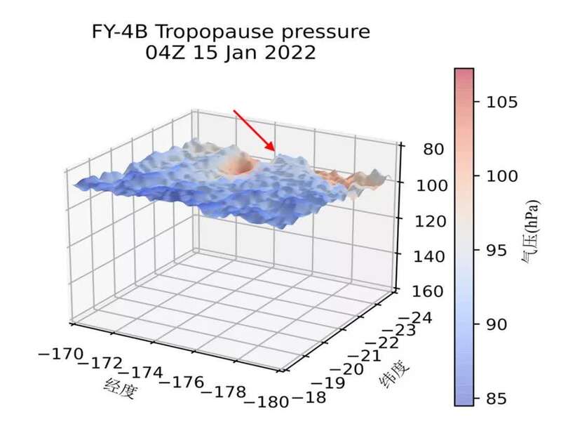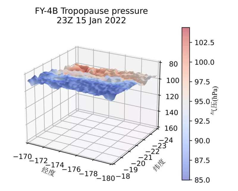 FY-4B汤加洪阿哈阿帕伊岛火山爆发对流层顶气压三维图(2022年01月15日19:00 汤加时)