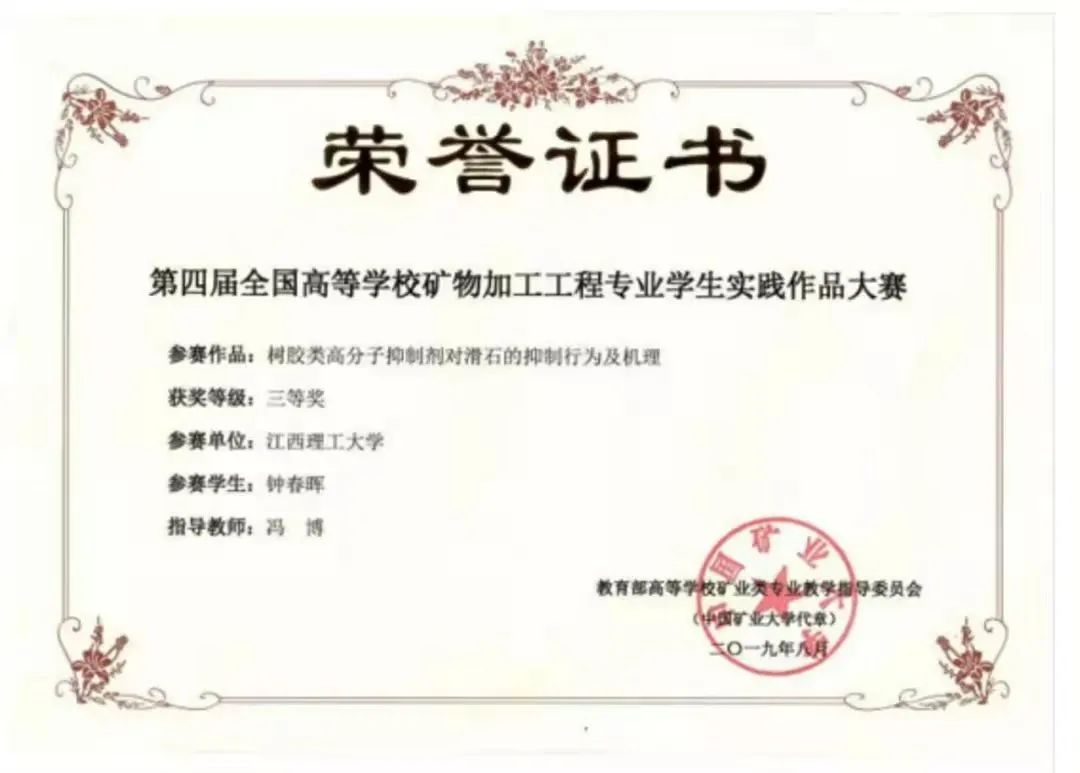 钟春晖,2021年宝钢奖学金获得者,首批江西省研究生“十佳学术之星”获得者中唯一一名硕士研究生,共获得省部级和校级荣誉30项,累计发表高水平论文13篇,主持研究生创新基金项目1项,参与国家自然科学基金面上项目、江西省自然科学基金重点项目等课题4项,申请发明专利2项,参加高水平学术会议4次、作学术报告3次,这些数字的背后诠释了获奖者——江西理工大学资环学院2019级矿物加工工程硕士研究生钟春晖所说的那句话——“我的大学生活很充实”。