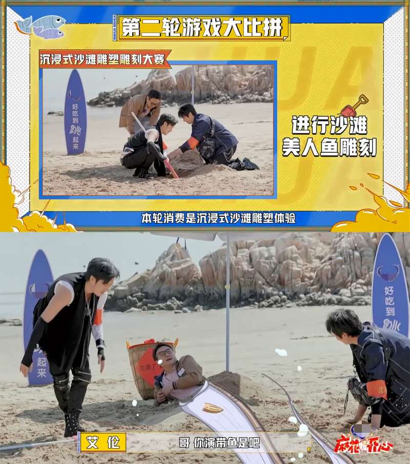 至于节目的脚本设计,起承转合颇为生硬,环节与环节之间并没有什么逻辑关联。游戏环节的设置,也颇为幼稚。比如第二期的的游戏比拼,从“沉浸式拍照体验”到“沉浸式沙滩雕塑雕刻大赛”,都挺莫名其妙的。