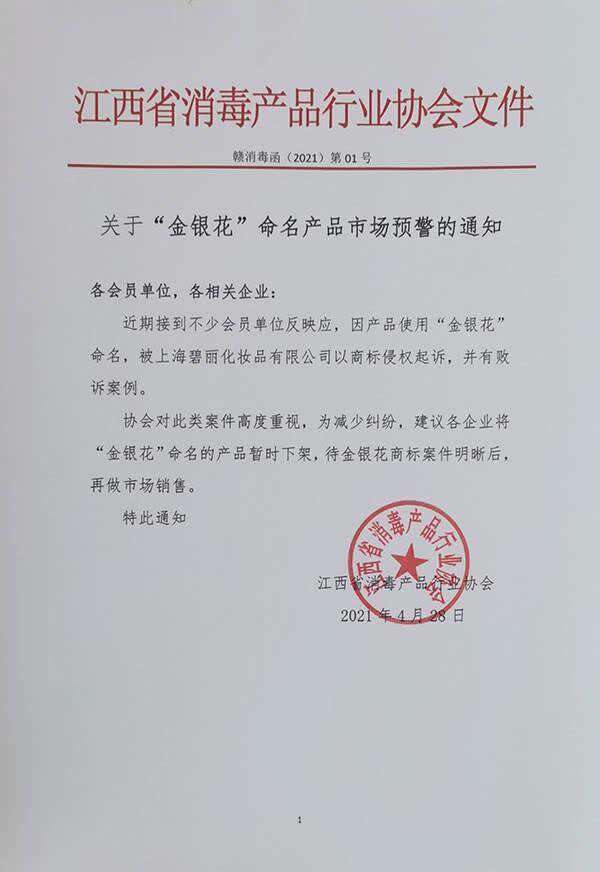 随着不断有法院判决败诉的案例传来,协会不得不在2021年4月28日向全体会员单位和各相关企业发出预警,建议各企业将“金银花”命名的产品暂时下架,待金银花商标案件明晰后,再做市场销售。