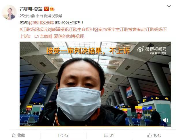 1月19日,江歌母亲江秋莲在个人微博发布视频称,她接受“诉刘暖曦(原名刘鑫)生命权纠纷”一案一审判决结果,决定不上诉。
