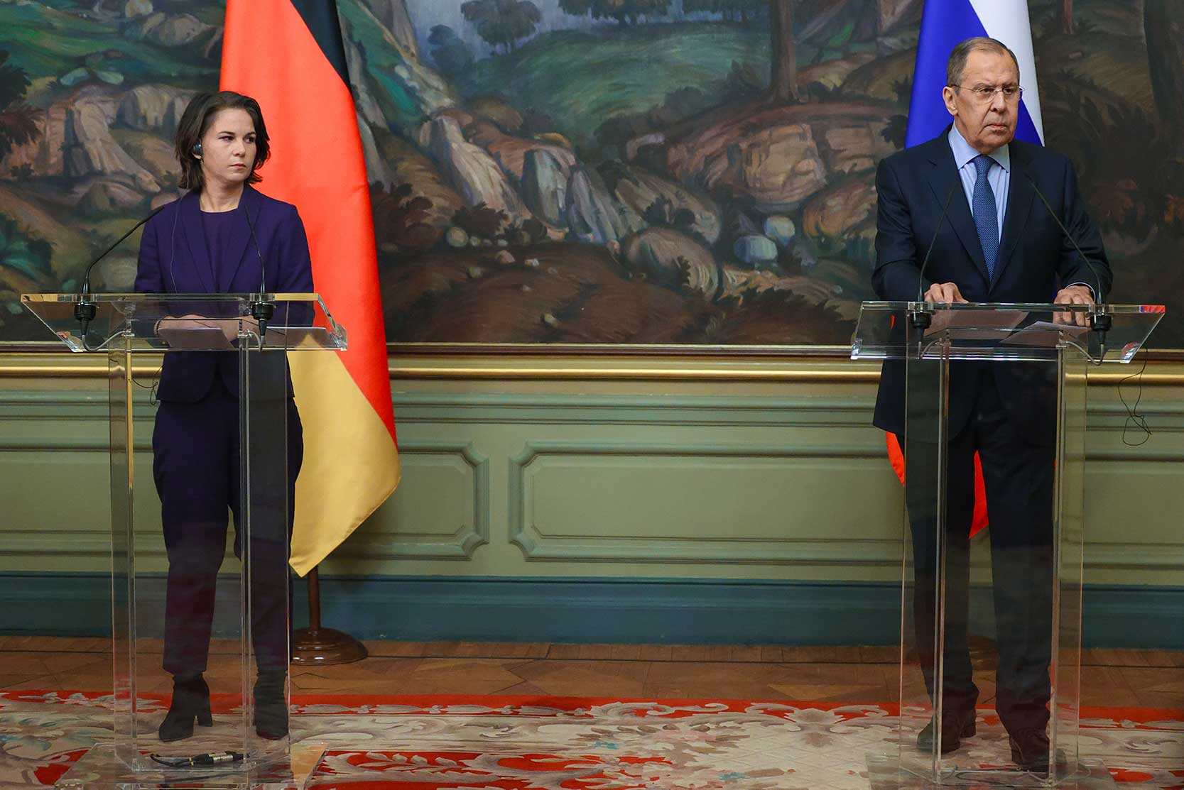 当地时间2022年1月18日,俄罗斯莫斯科,俄罗斯外交部长拉夫罗夫与访问俄罗斯的德国外交部长贝尔伯克举行了会谈。澎湃影像 图