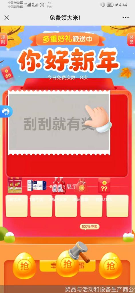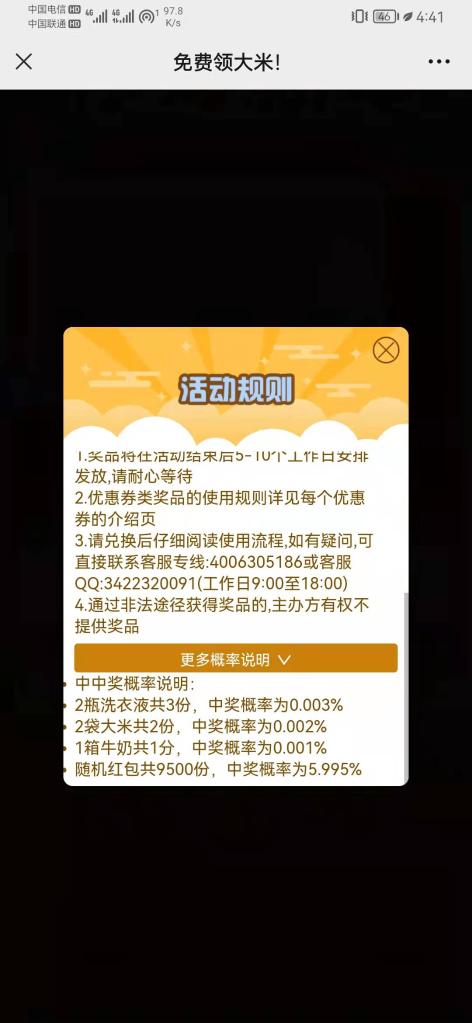 记者点开该抽奖页面角落处的“规则”看到,这种“幸运转盘”奖品设置有“2袋大米”“1箱牛奶”“5元红包”“随机红包”“幸运福袋”5项。只有在更为隐蔽的下拉式菜单“更多概率说明”中才能看到,牛奶只有1箱,中奖概率为0.001%,2袋大米也只有2份,中奖概率0.002%。
