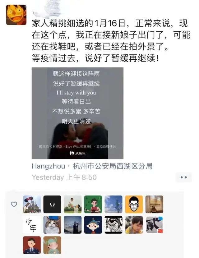 8时50分,正准备上岗的杨立博在朋友圈回了一条信息:“家人精挑细选的1月16日,正常来说,现在这个点,我正在接新娘子出门了,可能还在找鞋吧,或者已经在拍外景了。等疫情过去,说好了暂缓再继续!”