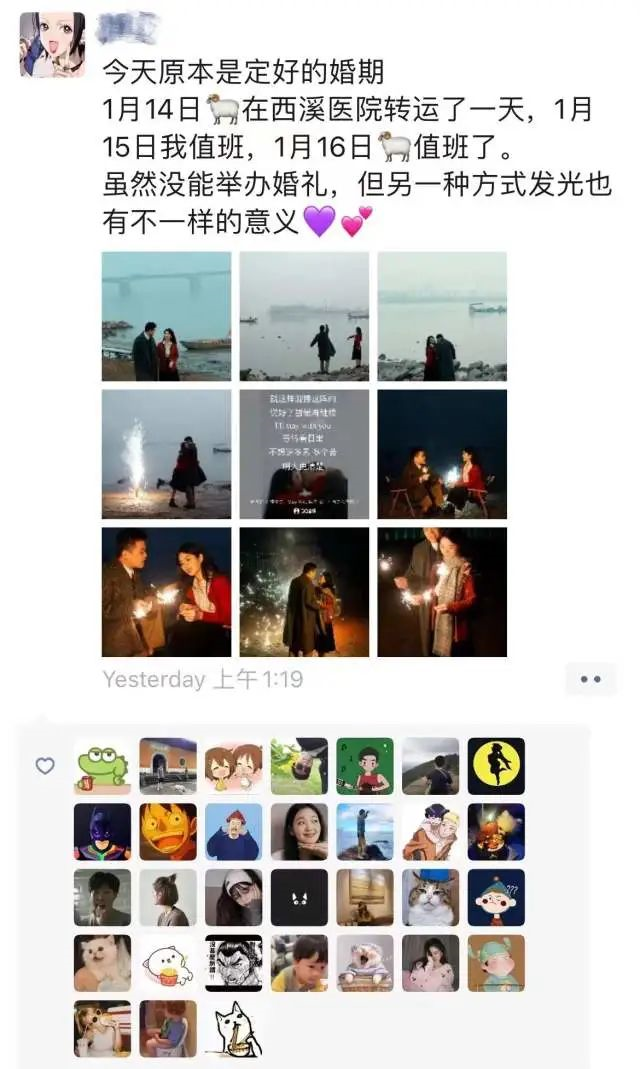 “今天原本是定好的婚期,1月14日羊在西溪医院转运了一天,1月15日我值班,1月16日羊值班了。虽然没能举办婚礼,但另一种方式发光也有不一样的意义。”