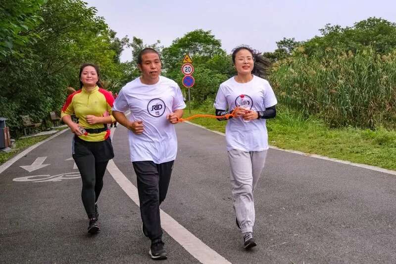 在她的陪跑下,王克泉从只能跑几公里,到可以跑20多公里,整个人都快乐起来了。现在,父女二人都加入了成都视障人群跑步的“黑暗跑团”。