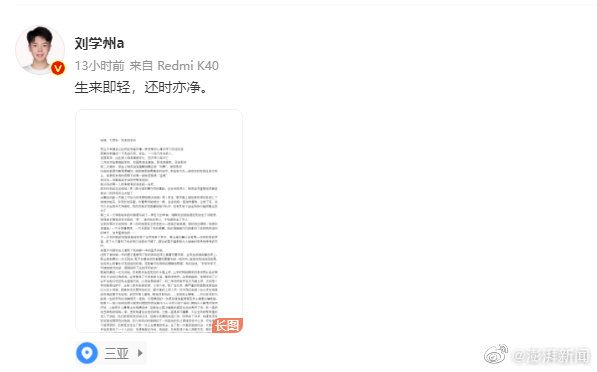 “阳光照在海面,我也归于大海。从这里结束自己的一生,也带走了这个世界上最美的风景。”刘学州在微博长文中讲述了这些年的经历,并透露出自杀倾向。1月24日上午,澎湃新闻从三亚市110指挥中心获悉,刘学州自杀,于当日凌晨经抢救无效死亡,具体情况仍在调查中。