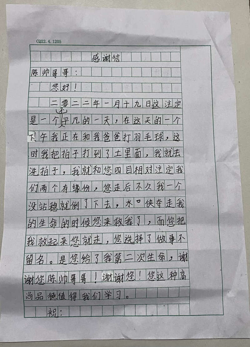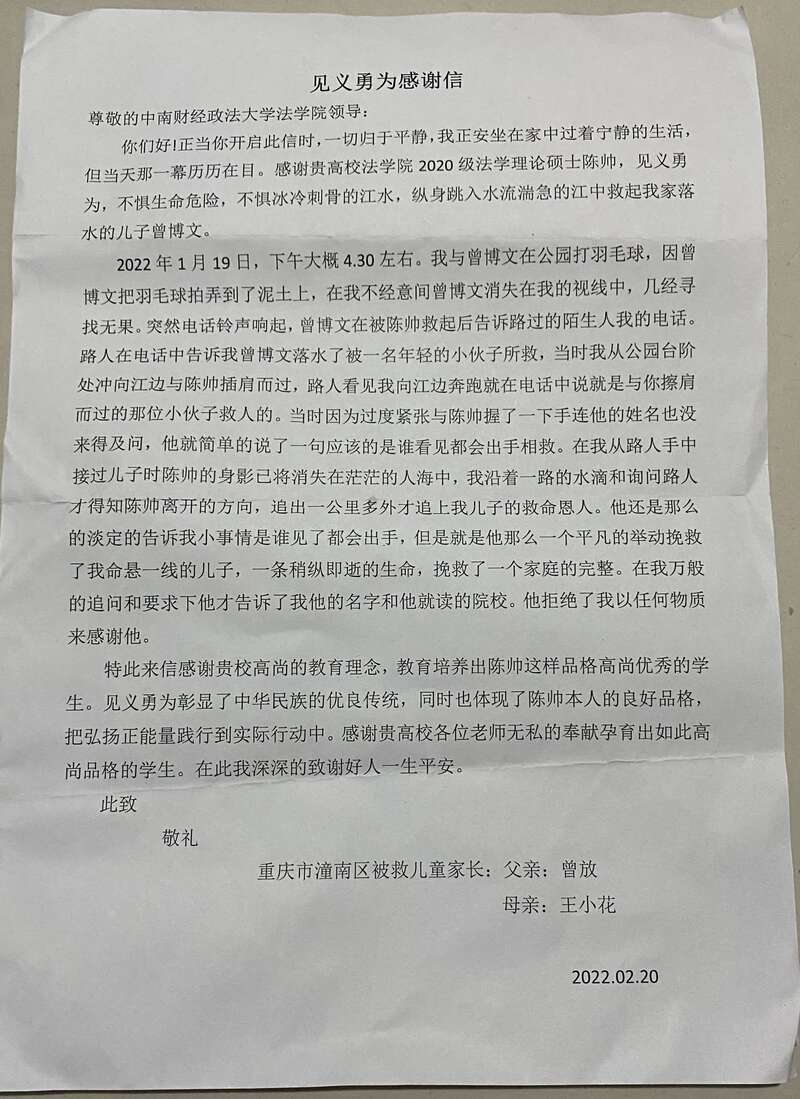 中国青年报客户端武汉1月24日电(卓张鹏 中青报·中青网记者 雷宇)近日,中南财经政法大学法学院收到一封来自一个重庆三口之家的感谢信,感谢该校法学院2020级法学理论硕士陈帅见义勇为,“不惧生命危险,不惧冰冷刺骨的江水,纵身跳入湍急的江水中救起我家落水的儿子,挽救了我们整个家庭”。