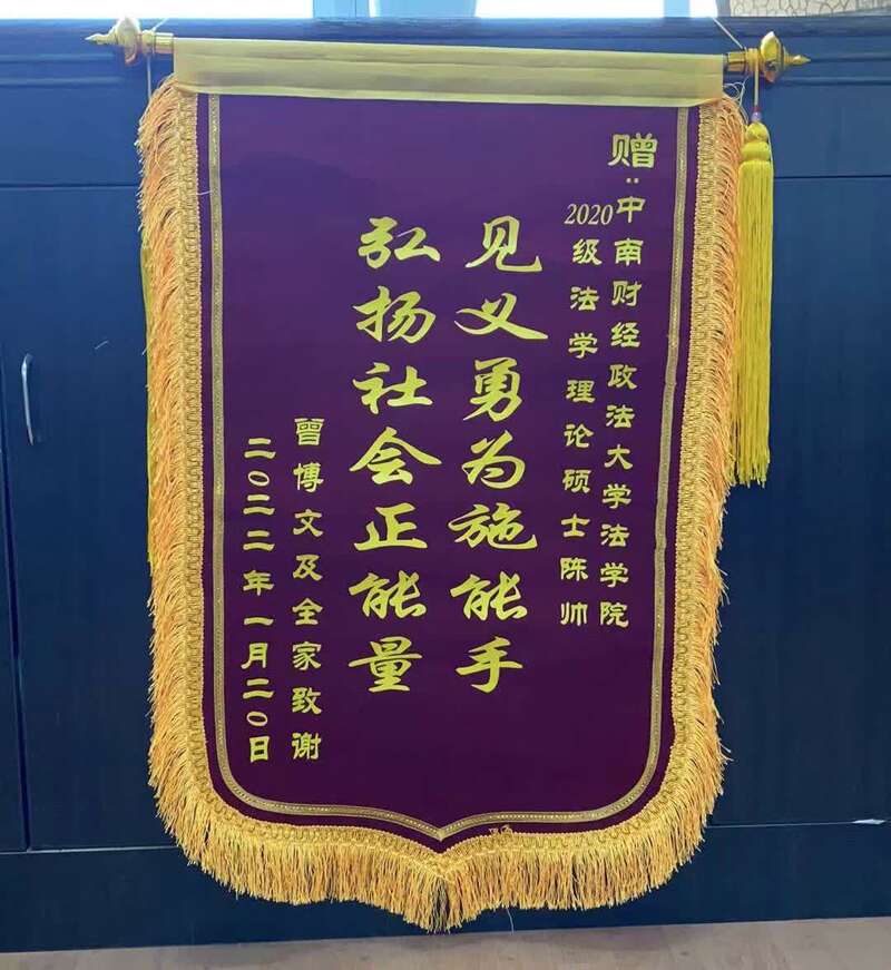 1月23日,中南财经政法大学收到了被救孩子一家的感谢信和锦旗,陈帅的见义勇为事迹被学校师生所知晓。“陈帅是个很不错的学生,还是班里副班长,入党积极分子,他身上散发着很多正能量。”法学院辅导员刘洁点赞到。