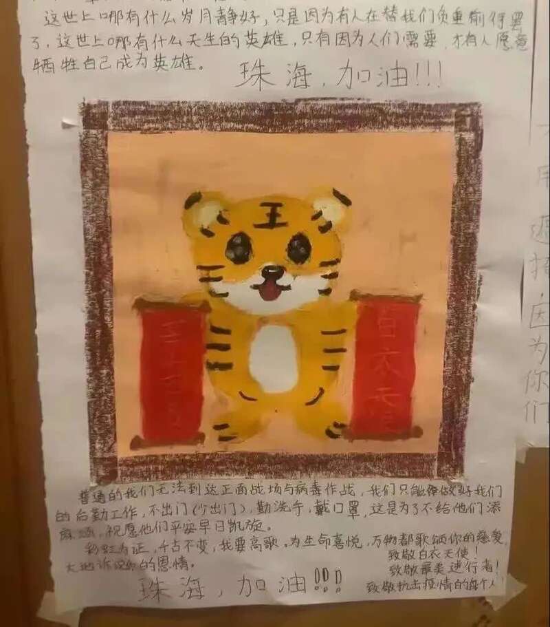 一天2次核酸检测、工作人员的昼夜不歇、忙前忙后,让小学三年级学生陈同学看在眼里、记在心里。16号,他突发奇想用画笔和文字寄托对工作人员的感谢和祝福,将虎年“虎虎生威”的寓意融合在画作里,致敬抗疫一线的工作人员。