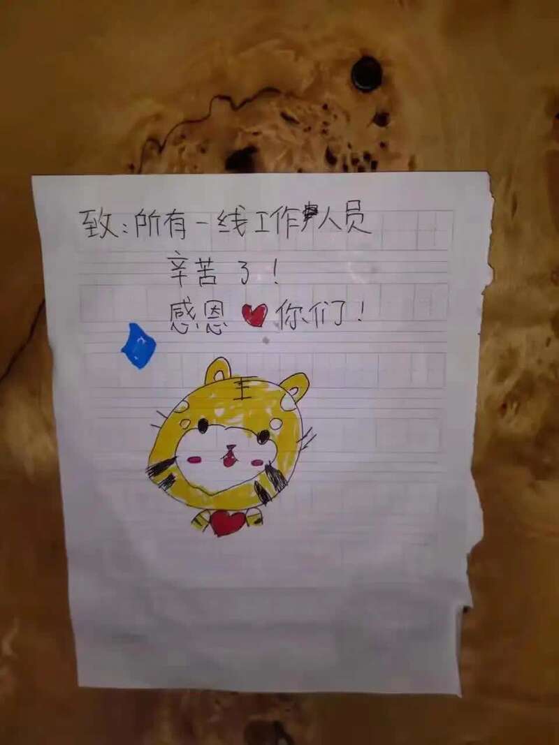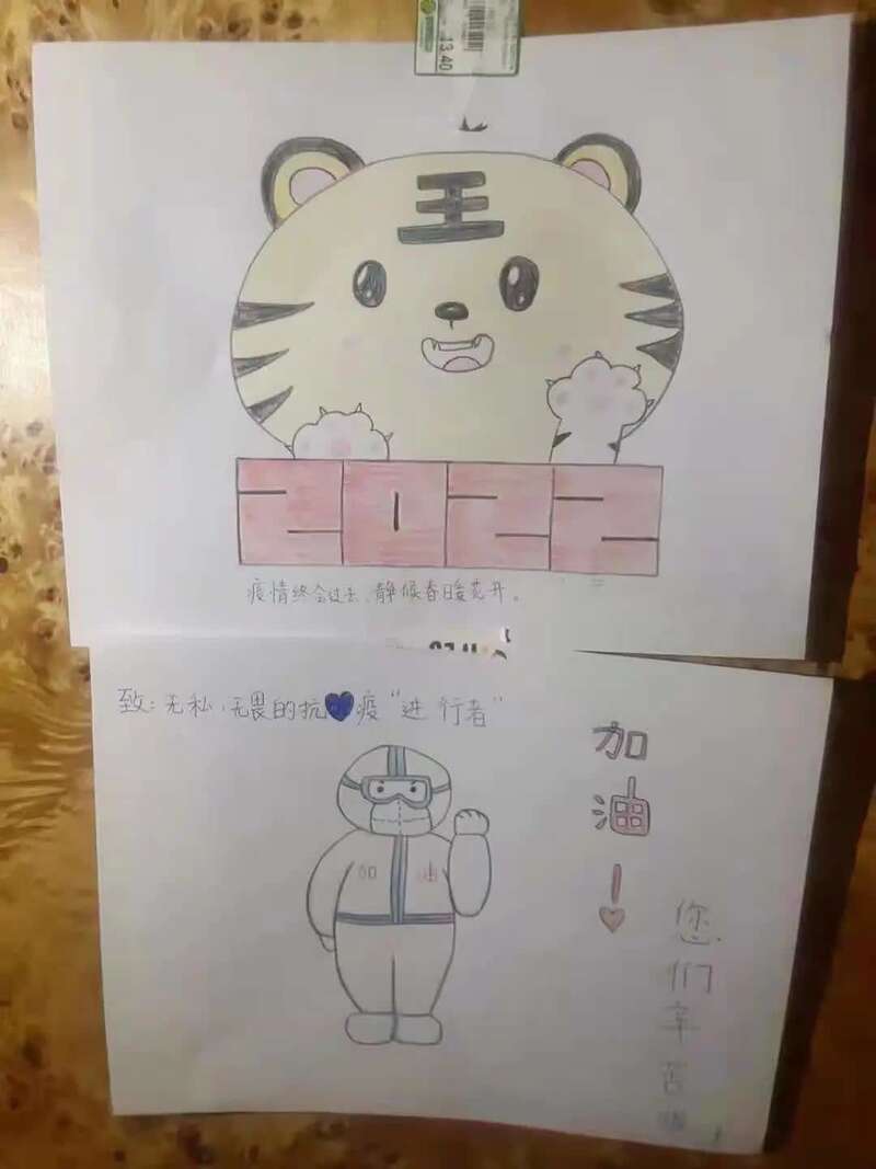 在这些简单稚嫩的画作里,画中笔笔皆真情。有的小朋友用自己的画笔记录着工作人员每天来来回回的工作,有的小朋友用小老虎来寄托对新的一年的美好期待。孩子们用自己的方式,表达着对工作人员悉心照料的感谢。
