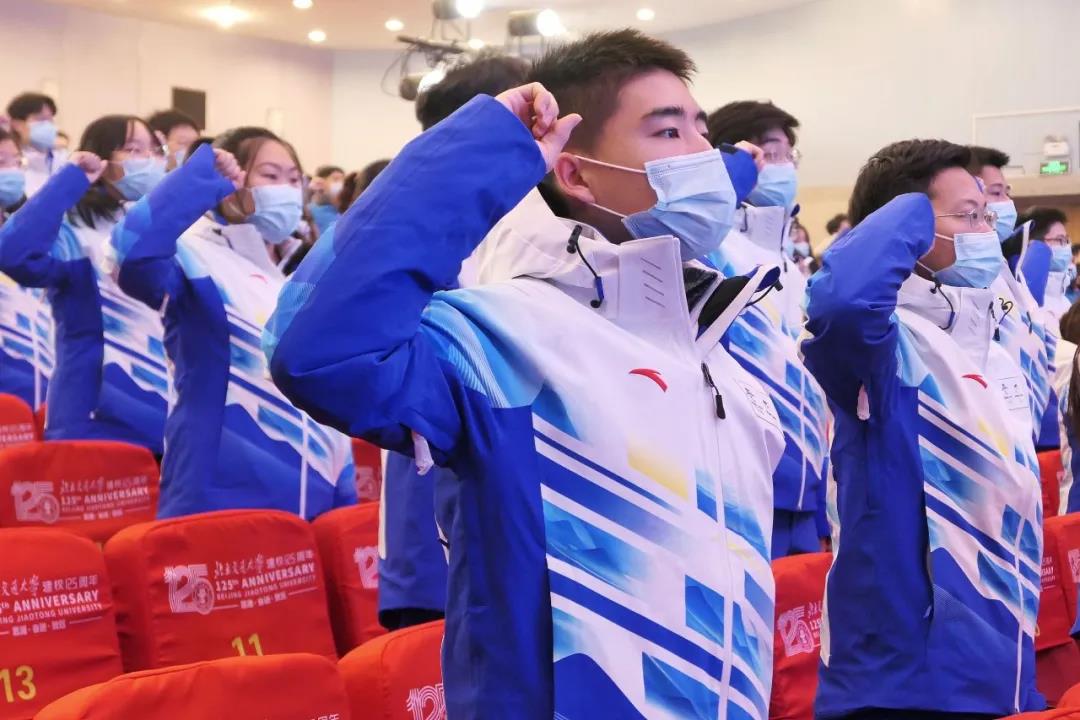 2022年1月18日,志愿者在北京交通大学2022年冬奥会和冬残奥会志愿者出征动员大会上宣誓。来源:视觉中国