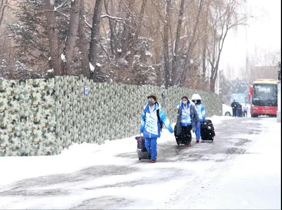 北京2022年冬奥会和冬残奥会延庆赛区驻地,志愿者们迎雪走进闭环住宿区。尹希宁/摄