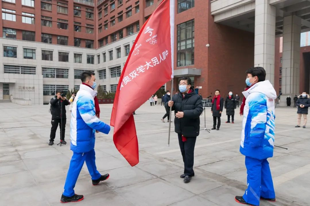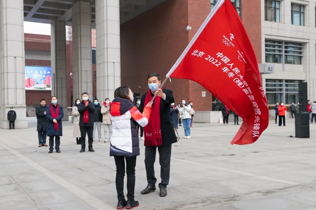 在简短而庄重的出征仪式上,张东刚、刘伟分别为服务保障北京2022年冬(残)奥会党员先锋队、“双奥青年”志愿服务队授旗。首都体育馆场馆群志愿者领域经理丁莉婷,校团委副书记、经济学院博士研究生陈诚作为代表接旗。