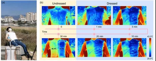 无源制冷光学超材料织物既能防晒,又可让人体体表温度降低近5摄氏度,具有优异的可穿戴性,与整个纺织行业相兼容,适合大规模推广制备和产业化应用。图为超材料织物与棉对人体体表降温对比测试(来源:Science)