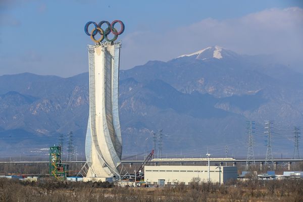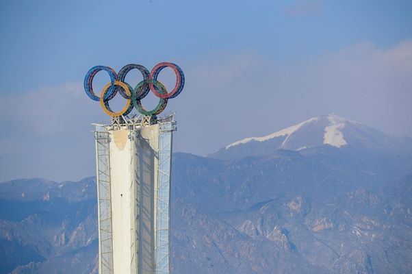 该建筑在120米塔顶装设巨型奥运五环标志,成为公众临近延庆赛区、经行京张高铁线或京礼高速线时一道靓丽的风景,是北京冬奥会重要标志性建筑之一。 中新社记者 贾天勇 摄