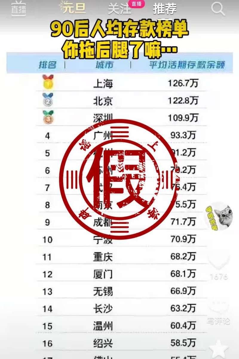 抖音号“喵姐说房”发布的《90后人均存款榜单》显示,上海、北京、深圳的90后平均活期存款余额分别为126.7万元、122.8万元和109.9万元,位居全国前三。在这张榜单里,上海90后的平均活期存款余额比前一份榜单里发布的上海家庭平均年收入更高。