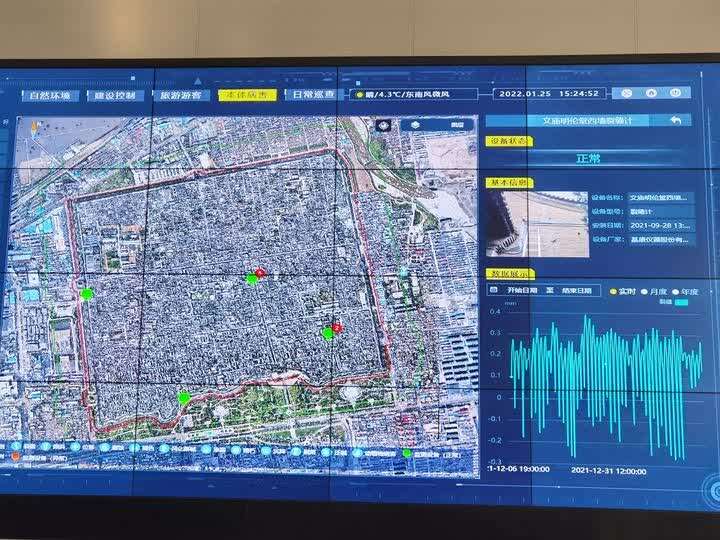平遥古城世界文化遗产监测预警系统平台已初步搭建。在平遥县一城两寺研究院遗产监测中心大厅可以看到,目前工作人员已在4个遗产要素点安装了前端监测设备,涉及城墙、市楼、文庙、协同庆票号旧址,重点监测裂缝和倾斜状况。