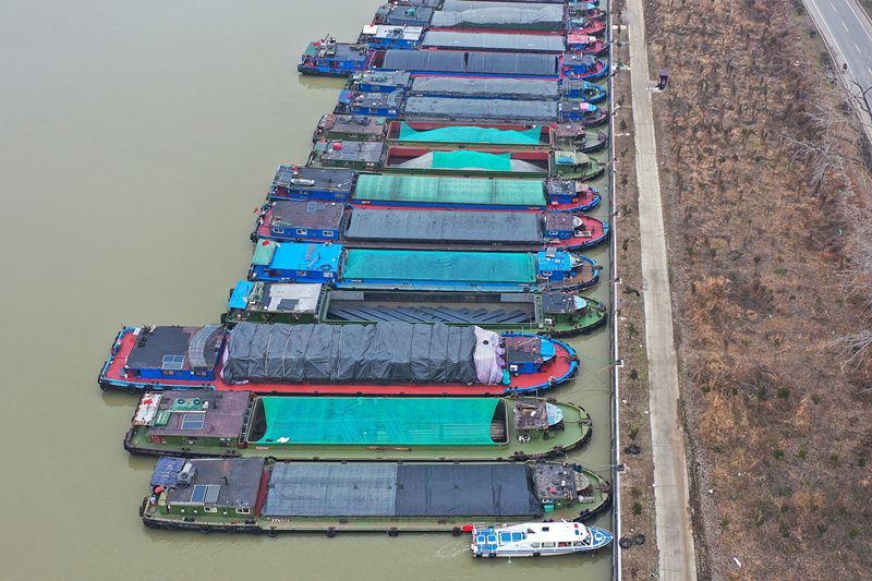 2022年1月27日,江苏省宝应县公安局水上派出所民警对京杭大运河宝应段沿线的停泊区开展雪前巡查。