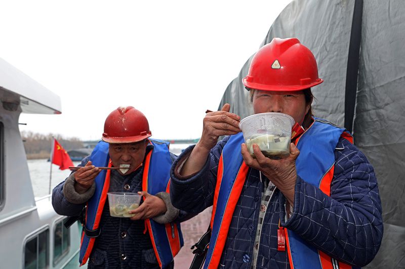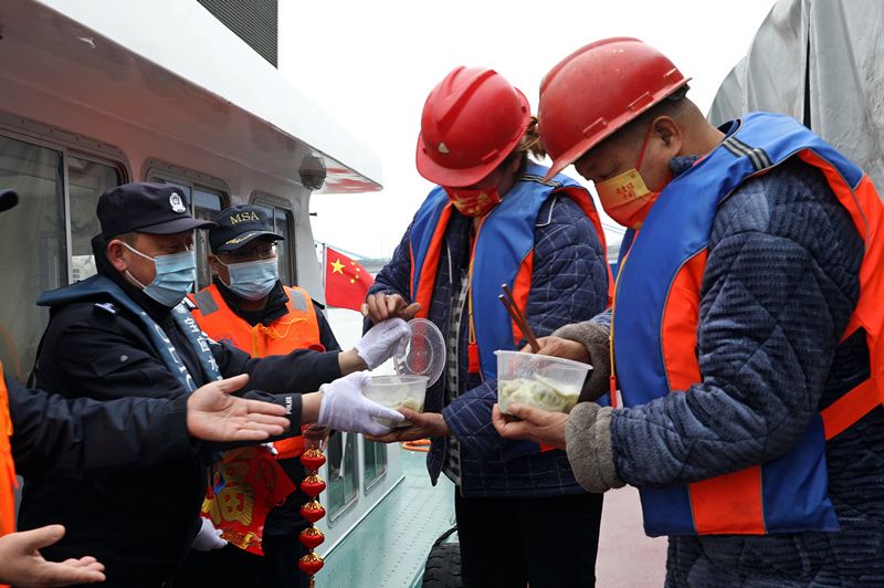 2022年1月27日,江苏省宝应县公安局水上派出所民警向留当地过大年的山东籍船员送上热腾腾的饺子,感受家的味道。