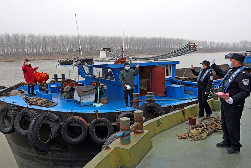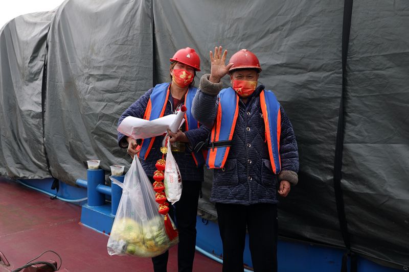 2022年1月27日,江苏省宝应县公安局水上派出所民警向留当地过大年的船员们运送大红灯笼、蔬菜大米、防疫礼包等,船员挥手致谢。