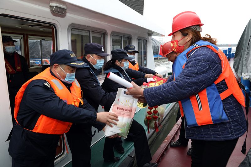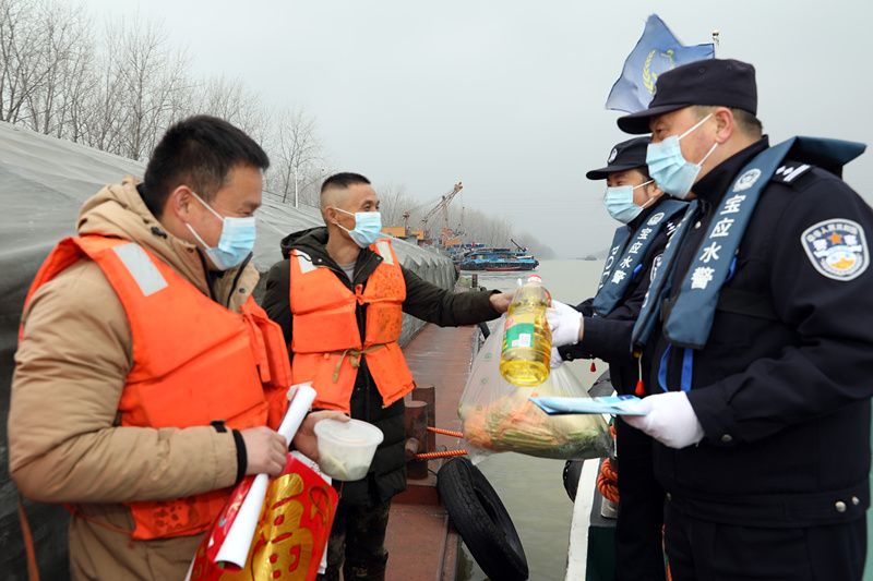 2022年1月27日,江苏省宝应县公安局水上派出所民警和海事工作人员向留当地过大年的船员们运送大红灯笼、蔬菜大米、防疫礼包等,红红火火迎接春节。