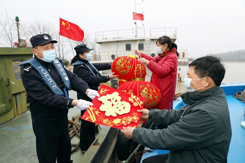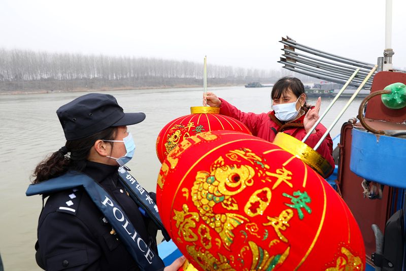 2022年1月27日,江苏省宝应县公安局水上派出所民警向留当地过大年的船员们运送大红灯笼、防疫礼包等,红红火火迎接春节。
