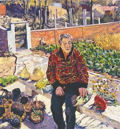 在一个向上扭曲的空间,妈妈还是充当着拯救者、抚育者,以及真正的悲伤者。但秋天的村庄赐予了画面足够的光亮和色彩,且它们很厚,层次感很强。妈妈坐在石凳上,毫无保留地被庄稼、水果、蔬菜包围,她的眼睛错过观众,像是找到了真正的期待。但一如上文提及,还有什么比浩荡的光明更令人悲伤的吗?这份悲伤就扎根在刘小东跨世纪浪漫而忧伤的艺术的深处。妈妈坐在低处,低于庄稼、树,低于光,但她同时又是画面中的最高者,所有高处的事物都融化在她那双手中。而只有如此的妈妈才能承接那些士兵、裸女、苦恼、失落,以及似乎已经无力了的激情。