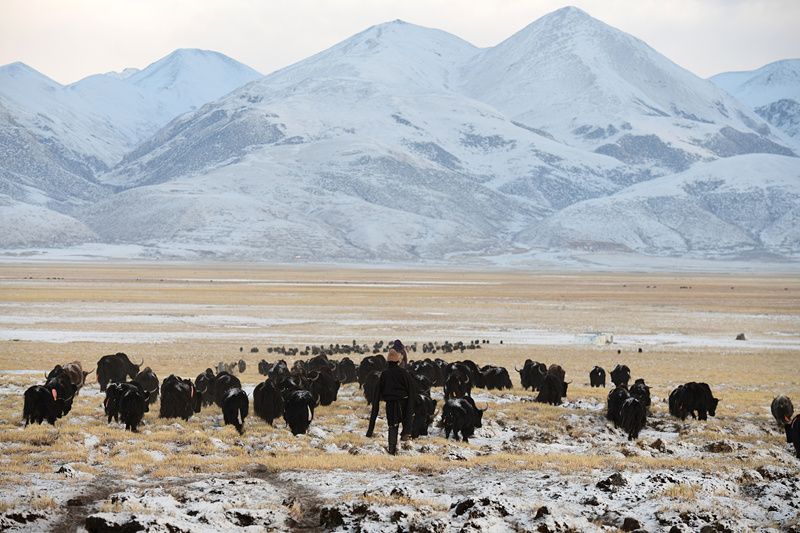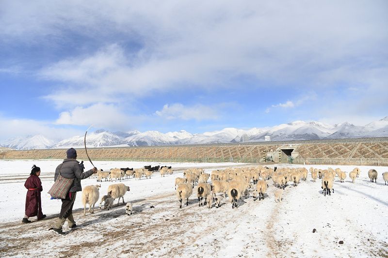 2022年1月27日,拉萨,当雄县龙仁乡乌达村牧民在雪中放牧。 中新社记者 贡嘎来松 摄