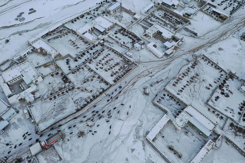 2022年1月27日,拉萨,当雄县龙仁乡乌达村牧民在雪中放牧。(无人机照片) 中新社记者 贡嘎来松 摄