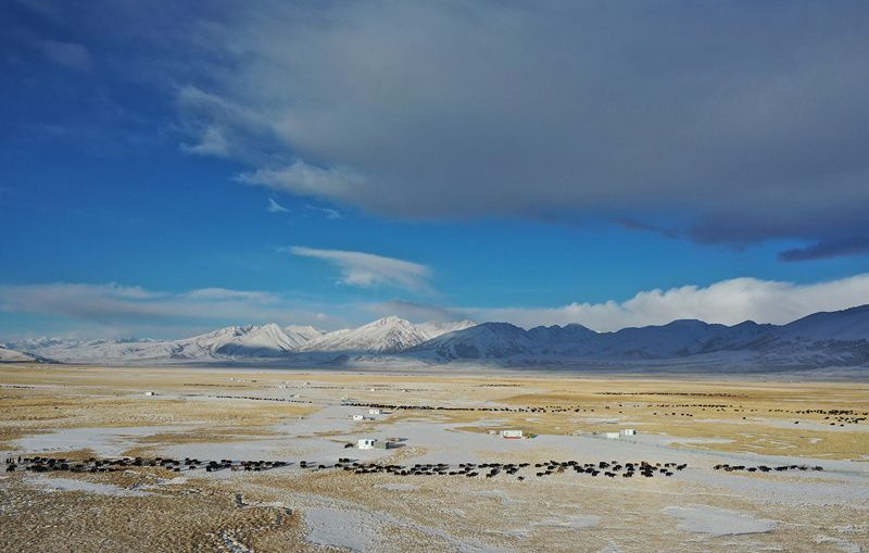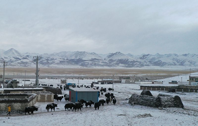 2022年1月27日,拉萨,当雄县龙仁乡乌达村牧民赶着牛羊去牧场。(无人机照片) 中新社记者 贡嘎来松 摄