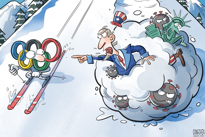 ▲面对国内疫情肆虐、乱象丛生,美国政府仍大搞体育政治化,污蔑抹黑中国无所不用其极。(漫画 | 宋晨)