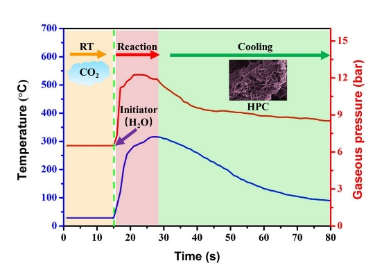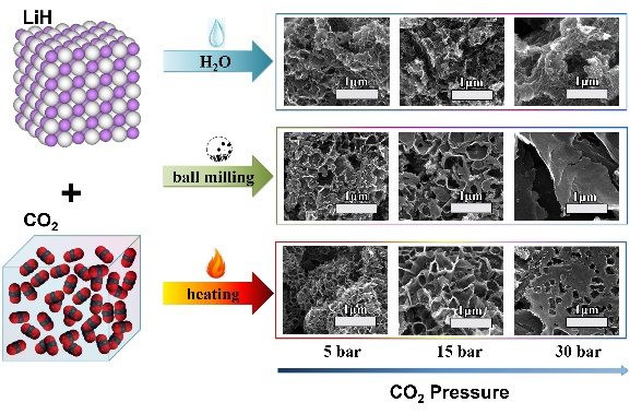 在室温条件下,梁初教授通过引入一滴水,CO₂即与LiH反应,并在~20 秒时间内转化为多孔碳材料。这一转化过程无有毒有害气体和温室气体产生、也无需加热,同步实现了CO₂的绿色高效节能转化和碳材料的可控合成。而且所合成的碳材料已在二次电池、超级电容器、催化剂、水和空气净化等众多领域得到了应用。