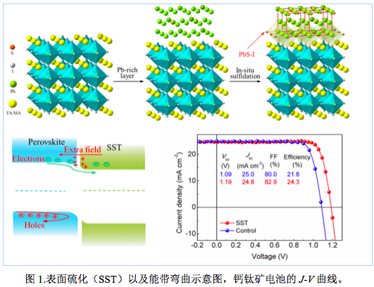 经过反复实验论证,方俊峰团队采用构筑表面异质结,提高器件内建电场的思路,首先在钙钛矿表面旋凃吡啶-2-羧酸铅制备富铅层,随后用高反应活性的六甲基二硅硫醚进行硫化,原位形成PbS-I层,实现钙钛矿表面费米能级的上移和能带弯曲,从而在钙钛矿界面处引入额外背场,构建出高效的界面异质结,抑制界面复合的同时,显著提高器件开路电压。