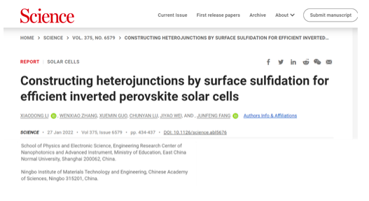 中国青年报客户端讯(中青报·中青网记者王烨捷)春节将至,《科学》杂志传来好消息。华东师范大学方俊锋团队在反型钙钛矿太阳能电池研究方面的最新科研成果被审稿人评价为“创造了新的反型钙钛矿电池效率世界记录,首次实现转化效率>24%的反型钙钛矿电池”“突破了反型器件效率低这一长期以来困扰钙钛矿电池发展的关键瓶颈问题,为钙钛矿电池的研究的开辟了新的思路与方向”。