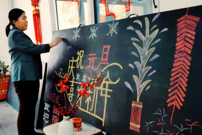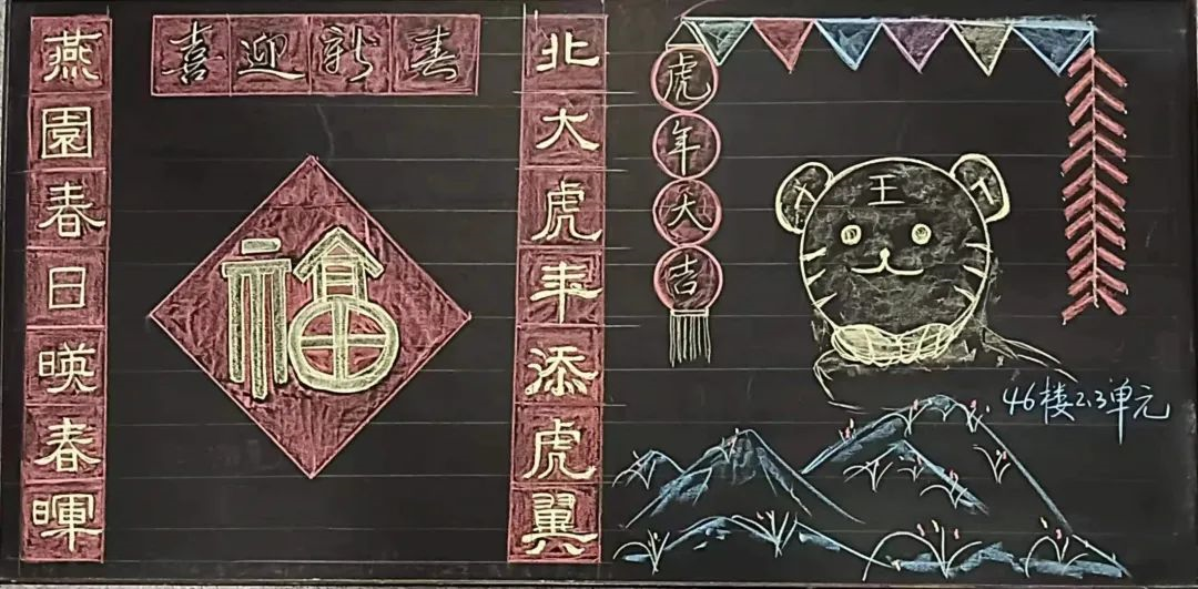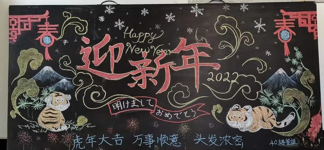 庆祝新年的黑板报上,鞭炮是传统元素,营造喜庆氛围。同学们生逢其时,以青春之小我融入到中华民族伟大复兴中国梦之大我,努力学习努力工作,争取更大成就。愿大家新年学习好、工作顺,平安喜乐。