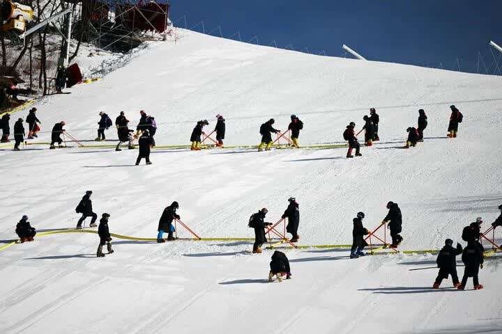 1月28日,工作人员在国家高山滑雪中心雪道上进行冰状雪制作。新华社记者 张晨霖 摄